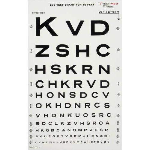 10 FT. DISTANCE * Snellen * Non-glare black letters * White transluscent plastic chart * Size: 14 x 9 * Shipping Carton Size: 12 L x 10 W x 6 H * Can be used independently or with an illuminated eye test cabinet (not sold by Complete)